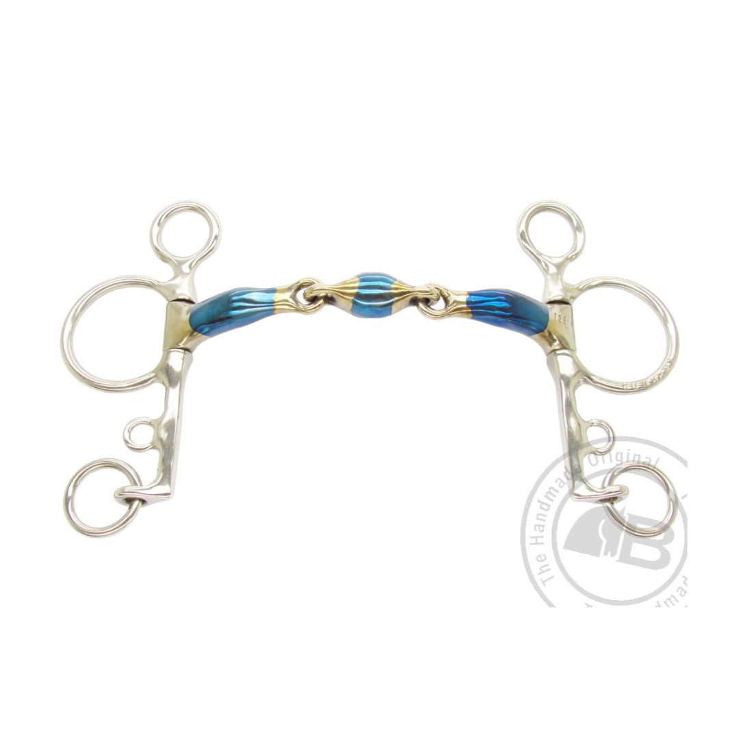 The Pelham has attachments for two reins, one near the mouthpiece and one at the end of the shank. Some riders, may prefer to use rein connectors. The Pelham shank will exert moderate poll pressure and leverage on the mouthpiece and curb.